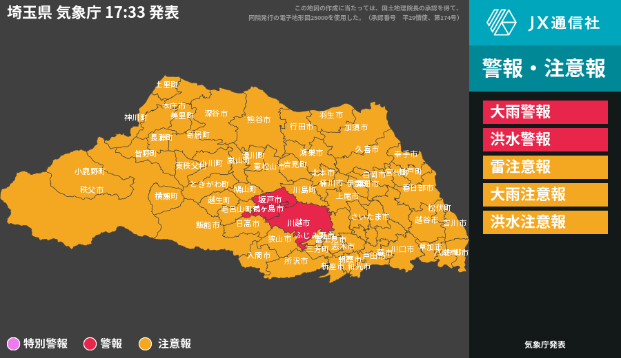 | 坂戸市 | 大雨警報 洪水警報 雷注意報 |