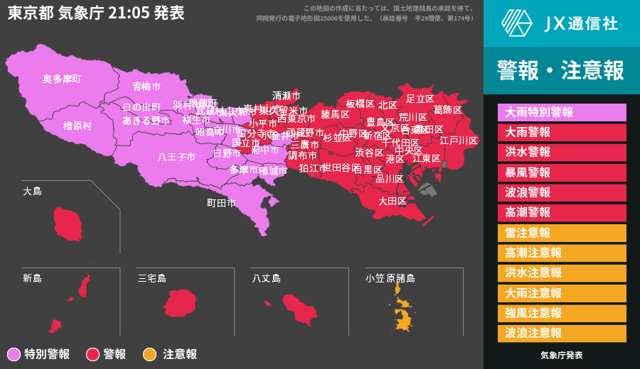 | 三宅村 | 暴風警報 波浪警報 大雨注意報 雷注意報 洪水注意報 高潮注意報 |