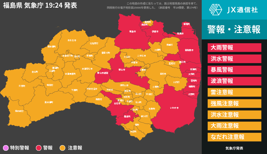 | 浪江町 | 暴風警報 波浪警報 大雨注意報 雷注意報 洪水注意報 |