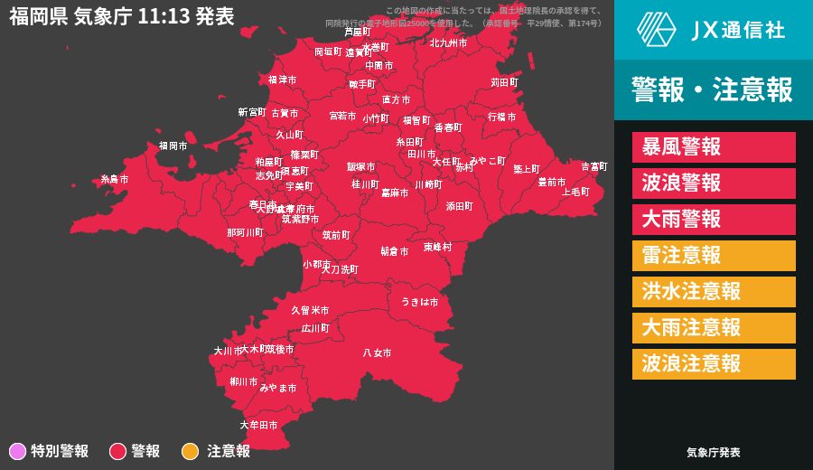 | 北九州市 | 暴風警報 波浪警報 雷注意報 洪水注意報 |