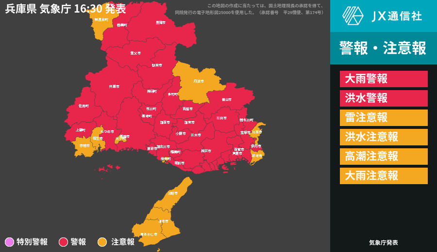 | 西宮市 | 大雨警報 雷注意報 洪水注意報 |