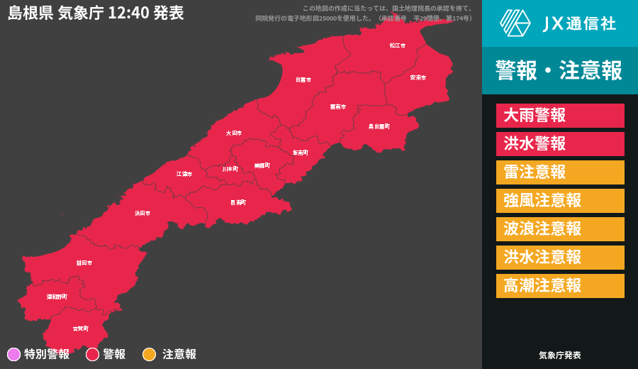 | 出雲市 | 大雨警報 洪水警報 雷注意報 強風注意報 波浪注意報 高潮注意報 |