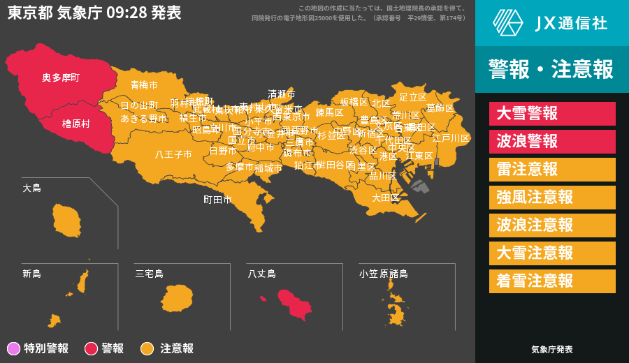 | 西東京市 | 大雪注意報 雷注意報 強風注意報 |