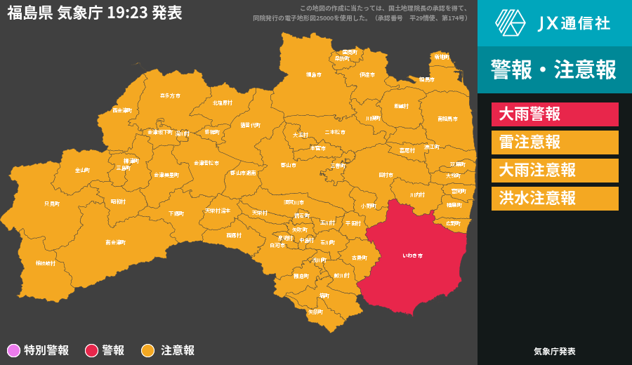 | いわき市 | 大雨警報 雷注意報 洪水注意報 |