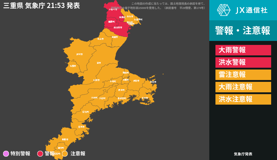 | 四日市市 | 大雨警報 洪水警報 雷注意報 |
