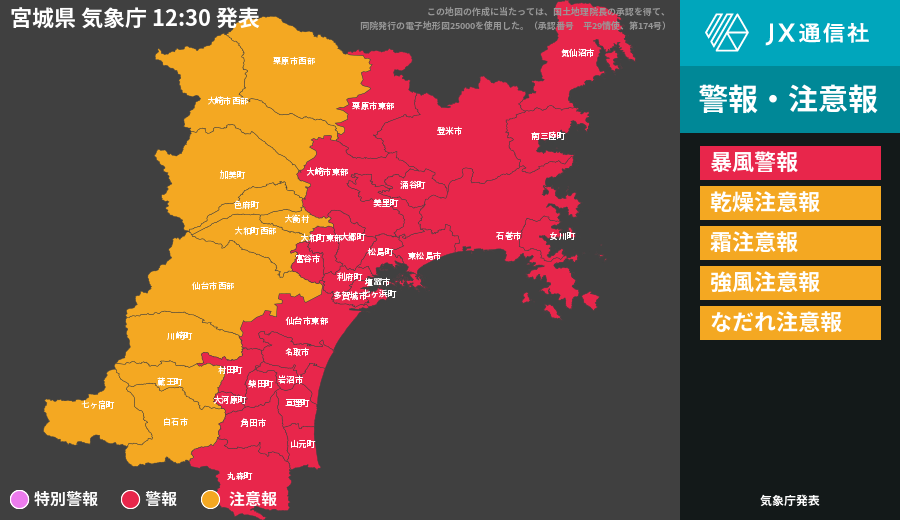 | 山元町 | 暴風警報 乾燥注意報 霜注意報 |
